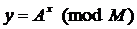 ), практически не разрешима за приемлемое время на современных ЭВМ (эффективного алгоритма вычисления дискретного логарифма пока не найдено). Поэтому модульная экспонента является однонаправленной функцией. Рассмотрим простую интерпретацию сказанного. Пусть А=2, х=2, М=4. Тогда