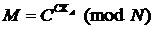 Однако знание секретного ключа СКА позволяет обратить данную функцию, то есть решить задачу дешифровки криптограммы C. Для дешифровки криптограммы С необходимо возвести ее в степень секретного ключа пользователя А по модулю N. Таким образом, дешифрование сообщения выполняется в соответствие с формулой