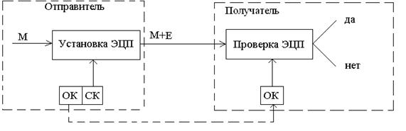 Процедура установки ЭЦП использует секретный ключ отправителя сообщения, а процедура проверки ЭЦП – открытый ключ отправителя сообщения (рис. 5.1). Здесь M – электронный документ, E – электронно-цифровая подпись.