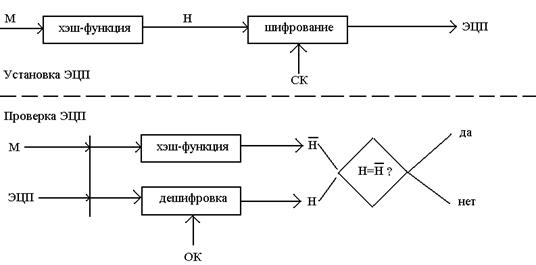 Электронно-цифровая подпись формируется как результат шифрования дайджеста сообщения с помощью секретного ключа, ставящего подпись. Схемы процедур установки и проверки ЭЦП представлены на рис. 5.2.