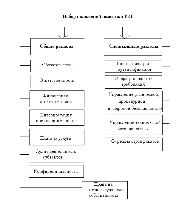 Политика и регламент применения сертификатов взаимно дополняют друг друга, формат их публикации устанавливается стандартом RFC 2527 - «Политика применения сертификатов и структура регламента». Перечень разделов, рекомендуемых к включению в описание политики PKI согласно данному стандарту, представлен на рис. 5.4.