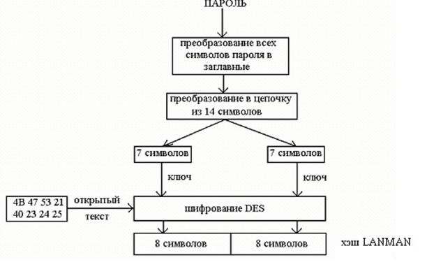 В алгоритме LANMAN используется свойство стойкости к атакам по открытому тексту алгоритма DES для формирования закрытых паролей. Даже зная 8-байтную последовательность, которая шифруется по данному алгоритму, восстановление ключа шифрования возможно только полным перебором.