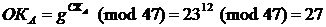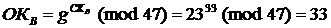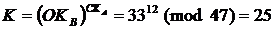 Возьмем модуль N=47 и примитивный элемент g=23. Пусть пользователи A и B выбрали свои секретные ключи СКА=12, СКВ=33. Тогда,