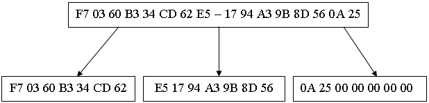 2. Полученный 16-байтовый хэш разбивается на 3 блока по 56 бит. Последний блок до 56 бит дополняется нулями.