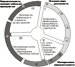 уязвимые виды деятельности – требуют изменения под влиянием глобализации, их представителей можно заменить техникой или более дешевым трудом в других странах. (а - малоквалифицированные работники, б - «синие воротнички», в - «белые воротнички», г- высококвалифицированные работники индустриальной экономики) изолированные виды деятельности – защищенные от конкуренции региональным или местным характером выполняемой работы. Специфика работы защищает представителей этих профессий от риска замены техникой (а – рутинный характер работы, б – более высокая квалификация, г– персональный характер работы); виды деятельности, имеющие глобальное преимущество – это виды деятельности, которые по характеру труда являются концептуальными и согласуются с процессом глобализации и формированием экономики знаний (а – технические виды деятельности, б - концептуальные виды деятельности);С точки зрения отношения к использованию существующих и созданию новых знаний в отраслевой модели экономики, уже перешедшей от стадии формирования к стадии развития, более или менее четко можно выделить четыре сектора (рис. 1.).