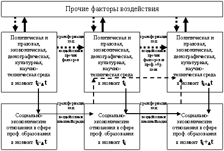В связи с этим трансформация социально-экономических отношений внутри профессионального образовательного поля и соответственно оказание воздействия на внешнюю среду происходит медленнее трансформации собственно внешней среды (под влиянием других факторов) и ее ответных воздействий (рис.2.).