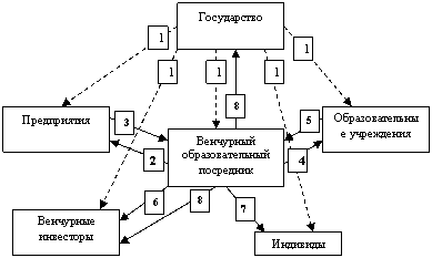 Венчурной образовательной услугой является новационная образовательная услуга, сформированная в соответствии с потребностями производственного сектора и общества, просматриваемыми в перспективном временном интервале. Содержание образовательной услуги формируется в зависимости от компетенций, предъявляемых предприятиями, на основании единого информационного прогнозного пространства, наполняемого государством. Венчурная образовательная услуга является объектом венчурного образования, рынок которого представлен шестью субъектами; наряду с трансформацией традиционных субъектов государством, образовательными учреждениями, предприятиями, индивидом добавляются венчурный образовательный посредник и венчурный капиталист.