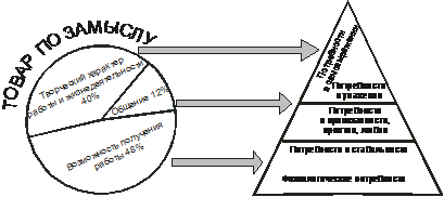 Понятие «товара (услуги) по замыслу» открывает глубинные нужды и потребности индивида, именно такое распределение может быть раскрыто посредством пирамиды А. Маслоу (рис.5.). Образовательная услуга в «реальном исполнении» выглядит, в первую очередь, в виде учебного заведения, которое предлагает определенную специальность определенной стоимости, наделенную качественными характеристиками. Высшую удовлетворенность индивида формирует третий уровень – товар «с подкреплением», в качестве атрибутов которого выступают: трудоустройство, стажировка, профессиональное консультирование, повышение квалификации, именно этот уровень генерирует «силы притяжения», возникающие между индивидом, получившим образовательную услугу, и профессиональным образовательным полем. Таким образом, образовательная услуга наделяется специфическими свойственными только ей атрибутами, которые определяют разный уровень восприятия образовательной услуги в качестве объекта маркетинга.