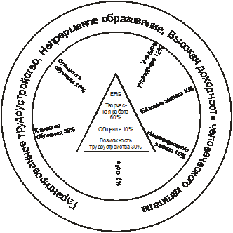 Потребитель желает получить посредством образования уверенность в завтрашнем дне, дополнительное общение и творческий характер деятельности. В отличие от идеи Маслоу о том, что доступ к более высоким уровням его пирамиды требует обязательной удовлетворенности на низких уровнях, области ERG являются одновременными потребностями. Роль непосредственно учебного учреждения значительно сокращается, так как оказание инновационных образовательных услуг будет прерогативой ограниченного количества специализированных вузов. При этом возрастает стоимость и качество обучения.