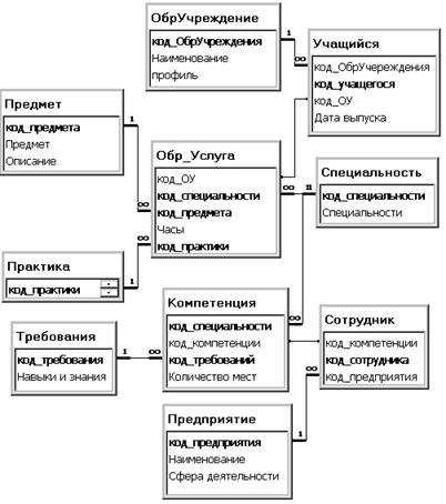 Ядро информационной системы формируется посредством базы данных, в качестве таковой предложена реляционная модель (рис.8.), позволяющая осуществлять различные статистические выборки данных для формирования прогноза состояния рынка труда в краткосрочном периоде. Прогнозирование в долгосрочном периоде невозможно без непосредственного участия государства при привлечении специализированных учреждений и анализа ведущих научных разработок.