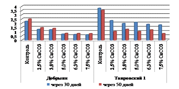 У формы Таировский 1 разница между показателями контрольных и опытных вариантов была меньше, чем у сорта Добрыня. У растений на средах с активным кальцием содержание хлорофиллов «а» и «b» снижалось по сравнению с контролем на 38,7-52,3%, каротиноидов - на 32,9-51,9% (рис. 1). Однако, через 50 дней у растений Таировского 1, в отличие от Добрыни, зафиксировали значительное падение содержания пигментов в тканях листьев, в некоторых вариантах - более чем в два раза. Это показывает ухудшение состояния микроклонов в условиях засоления питательной среды активным кальцием, что подтверждается и показателями роста, в частности, меньшими значениями высоты стебля и биомассы прироста.