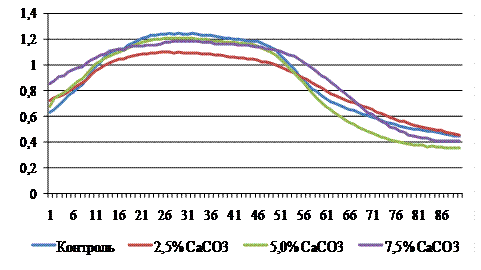 Максимальные величины флуоресценции достигали 1,1783-1,2681 отн. ед. (для сравнения - в контроле максимум флуоресценции составил 1,1085 отн. ед.). Наиболее высокие значения были в вариантах 6,3-7,5% CaCO3. У подвоя Таировский 1 наибольший выход флуоресценции зафиксировали в контрольном варианте (Fmax = 1,2373 отн. ед.), у вариантах с активным кальцием графики ИФХ находились на более низком кинетическом уровне, чем в контроле (на 11,6-28,8%). Интенсивность флуоресценции контрольных растений подвоя Добрыня была ниже, чем в опытных. Для сорта Таировский 1 была характерной противоположная закономерность: все микроклоны, выращенные на среде с активным кальцием, имели меньшие максимальные показатели флуоресценции по сравнению с контролем, что вместе с уменьшением количества хлорофиллов свидетельствует об общем угнетении фотосинтетической активности растений под влиянием активного кальция.