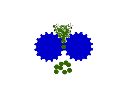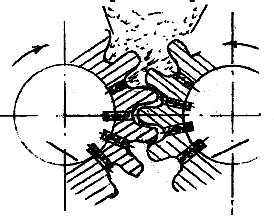 Естественно, что форма ячеек может быть самой разнообразной. Продукт, попадая в ячейки вальцов, подвергается обжатию, а затем выпадает из них в виде спрессованных гранул определенной формы. Вследствие кратковременного усилия гранулы получаются непрочными. К недостаткам таких прессов относится также низкая производительность и большая энергоемкость. Поэтому такие прессы нашли лишь ограниченное применение. Шестеренчатые прессы.