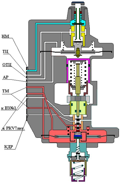 - Магистральная камера. Камера над магистральной диафрагмой. По каналу, через ВЗ№2 сообщается с ТМ и при нейтральном положении МД через отверстие в верхней части зажима МД (d = 0,8 mm) и открытое седло КЗ с рабочей камерой главной части ВР и РКV7лит.