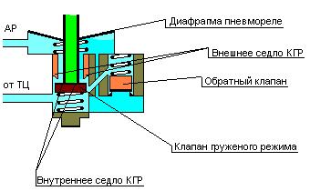 - клапан груженого режима пневмореле (КГР) Имеет 2 седла. Внутренним седлом является нижний торец полого толкателя диафрагмы пневмореле. Внешнее седло выполнено в корпусе пневмореле.