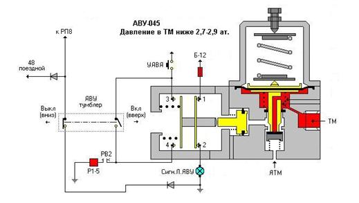 Как известно пневматический тормоз обладает так называемым «свойством мягкости», т. е. при утечке сжатого воздуха из тормозной магистрали темпом мягкости (0,3 – 0,5 ат/мин.), воздухораспределитель не осуществляет пневматического торможения. Это происходит потому, что при падении давления в магистральной камере в главной части ВР, одновременно давление падает в рабочей камере главной части ВР и в рабочей камере объемом 7 литров, так как воздух из них успевает свободно проходить через открытое, внешнее седло клапана зарядки и калиброванное отверстие d=0,8 мм. в верхней части зажима магистральной диафрагмы не вызывая разницы давления в рабочей и магистральных камерах главной части ВР. Так как такие утечки, при не своевременном обнаружении их машинистом весьма опасны, для контроля за подобными ситуациями, был разработан прибор безопасности АВУ-045. АВУ-045 предназначен для контроля за давлением в тормозной магистрали. При падении давления в тормозной магистрали ниже отметки в 2,7 – 2,9 ат., АВУ-045 размыкает свой контакт в цепи катушки Р1-5 (цепь управления) и включает ВЗ№1 на всех вагонах состава. АВУ-045 по конструкции относится к клапанно-диафрагменно-поршневым, электропневматическим приборам. АВУ-045 условно можно разделить на две части – пневматическую и электрическую (контактную). АВУ-045 установлен в кабине машиниста, перед УАВА. У машиниста, в предусмотренных случаях, есть возможность отключить АВУ-045 при помощи тумблера, который расположен на пульте и опломбирован.