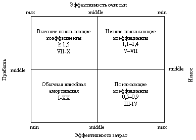 Нелинейный метод списания износа всегда выгоднее линейного. Мотивационные резервы амортизации обнаруживаются, если у предприятия открывается возможность получения трех эффектов одновременно: капитализация части стоимости, накопленной в первые годы использования основных средств; восстановление основных средств; рыночная экономическая оценка имущества. По мнению автора, целесообразно применять дифференцированный подход к выбору законодательно предусмотренных (гл. 25 НК РФ) понижающих и повышающих коэффициентов амортизации по разным «налоговым» группам с учетом таких факторов как износ основных средств, эффективность очистки, эксплуатационные затраты и получаемая прибыль от реализации продукта (рисунок).