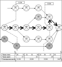 е) жирные стрелки – критический путь; ж) простые стрелки – технологическая связь