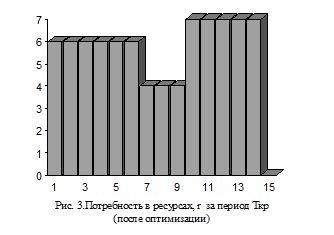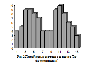 В системах СПУ возникают следующие задачи оптимального распределения ресурсов: распределение ограниченного количества персонала по объектам реновации и равномерная их загрузка в процессе выполнения работ. В ходе решения этих задач достигается и сокращение сроков реновации за счет достижения ритмичности и роста производительности труда на объектах. На рис. 3. потребность приведена до оптимизации ресурсов, а на рис. 4. – после проведенной оптимизации.