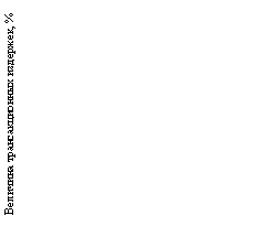 Издержки суррогатов денежных средств (взаимозачетов). К 1996 г. в результате гиперинфляции и возрастания задолженности государства за выполненные работы предприятия ОПК практически лишились своих оборотных средств. Чтобы как-то улучшить ситуацию государство начало широко использовать в своих расчетах с предприятиями ОПК взаимозачеты по налогам на местном и федеральном уровнях. Использование взаимозачетов позволило предприятиям в условиях тотального дефицита денежных средств рассчитываться по налогам и за энергоносители. Однако необходимость выплаты заработной платы заставляло предприятия реализовывать часть своих квот на взаимозачеты за «живые» деньги на свободном рынке с дисконтом. Относительная величина этого дисконта к фактическому поступлению средств, по сути, является трансакционными издержками в период институциональной трансформации за счет несовершенства рынка, когда используются такие суррогаты денежных средств, как взаимозачеты. Проведенная по такой методике оценка приведена на рис. 3.