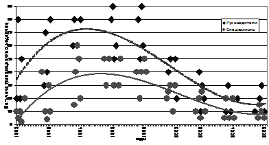 Как видно из рис. 1, временная зависимость трансакционных издержек за счет отлынивания в период институциональной трансформации российской экономики имеет хорошо выраженный максимум в 1994–1995 гг. Причем, абсолютная величина максимума, по мнению руководителей, почти в 2 раза выше, чем у специалистов. Такое расхождение можно объяснить, с одной стороны, растерянностью руководства в ситуации резкой смены положения и статуса «оборонки». С другой стороны, у руководителя всегда больше возможности найти дополнительные работы.