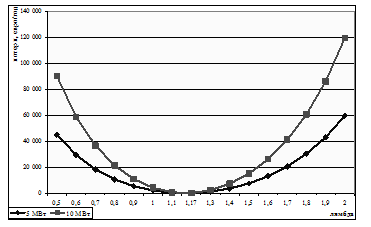 На рис. 1 приведена зависимость величины расхода газа (или его потерь), соответствующая критерию minP, от основного параметра энергоустановок (λ – соотношение масс газа и воздуха). Здесь варианты энергосистемы (энергосбережения) с величинами λ от 0,9 до 1,4 образуют «зону неопределенности оптимального решения», поскольку значения критерия min P в них отличаются не более чем на 2–4%. Для раскрытия такой неопределенности (типичной для энергосистем) используются дополнительные критерии минимальных затрат и минимаксного риска; последний позволяет избежать риск слишком больших расходов (потерь) энергоносителя (газа) при появлении неблагоприятных условий функционирования системы энергосбережения.