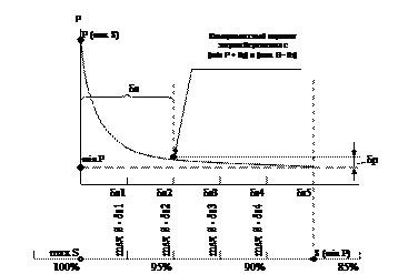 На рис. 2 представлена графическая интерпретация обоснования уступок δP и δS критериям min P и max S. Здесь в результате много (двух) критериальной оптимизации рациональный вариант энергосбережения соответствует решению, когда расход (потери) энергоносителя больше теоретически минимальных на величину δP, а негативное воздействие на окружающую среду снижает ее природно-ресурсный потенциал не более, чем на 5%.
