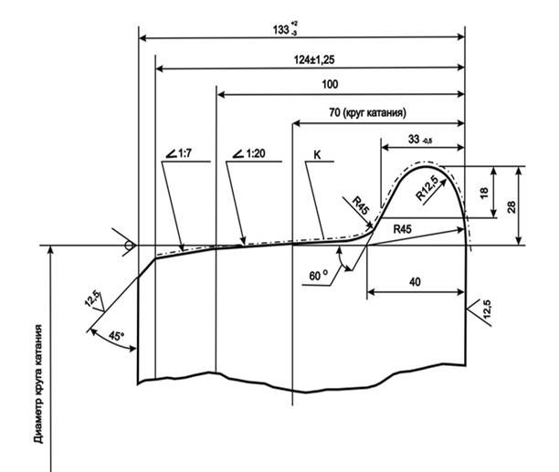 Поверхность катания колес вагонов метрополитена в средней (рабочей) части имеет коническую форму с уклоном 1:20, и затем на протяжении 30 мм до наружной плоскости колеса переходит в другую конусность 1:7