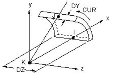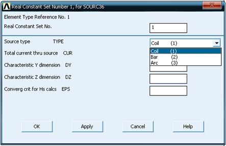 Данный элемент обладает следующими вещественными константами: TYPE (тип), CUR (ток), DY (толщина стенки кольца (дуги) или ширина пластины), DZ (длина кольца (дуги) или пластины), EPS (конвергенция исходного поля).