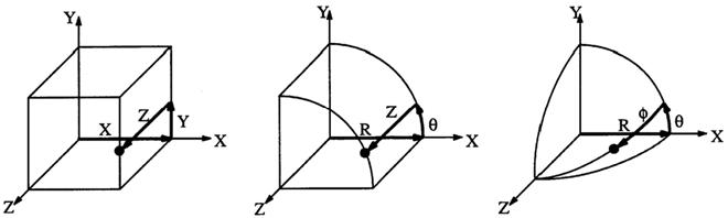 Рисунок 3.81 – Типы предопределенных глобальных координатных систем в ANSYS: а) декартова (X, Y, Z) система координат (CS-0); б) цилиндрическая (R, θ, Z) система координат (CS-1); в) сферическая (R, θ, j) система координат (CS-2)
