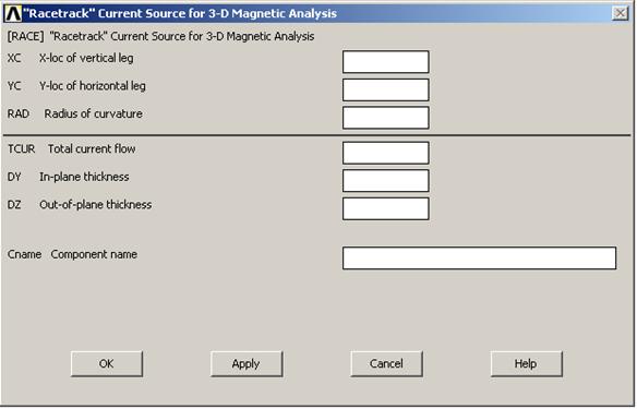 Программа ANSYS выводит окно настроек токового объекта «Racetrack» Current Source for 3-D Magnetic Analysis (рисунок 3.87). Для создания токоведущей катушки необходимо ввести пять параметров, определяющих геометрию обмотки, один электрический параметр и один текстовой, задающий название создаваемого элемента.