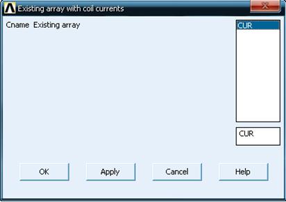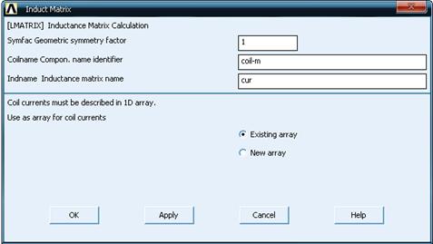 После ввода значений программа ANSYS потребует указать в окне Existing array with coil currents, какой массив данных следует использовать для расчета индуктивности, т. к. он единственный, то нужная матрица будет уже выбрана (рисунок 3.95).