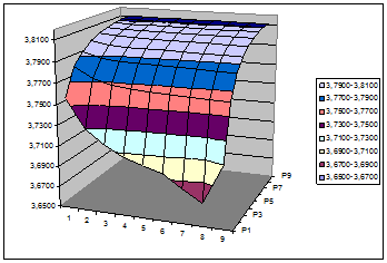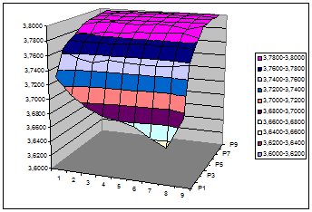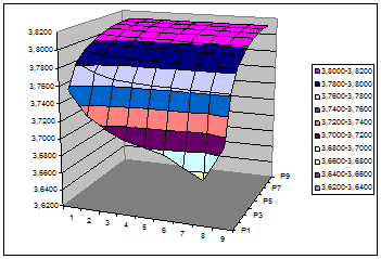 Рисунок 2.2 – Поверхность изменения величины конструкционного модуля, вдоль стенки, в функции: 1-9 – угол скоса полюсов (α); Р1-Р9 – длина тонкой шунтирующей стенки (β)