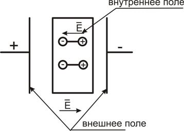 Сила взаимодействия зарядов, а значит и напряженности электрического поля зависят от характера среды, в которой происходит взаимодействие. Влияние вещества среды на электрическое поле вызывается поляризацией вещества под действием поля. При этом молекулы вещества, обладающие собственным дипольным моментом и хаотически ориентированные в отсутствие внешнего электрического поля, приобретают под его воздействием упорядоченную ориентацию, создавая собственное электрическое поле, а свободные заряды начинают двигаться направленно (см. рисунок 1.2).
