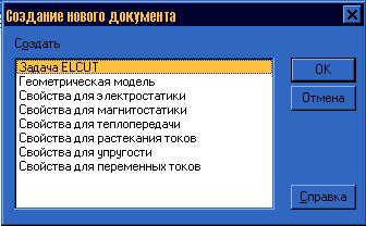Чтобы создать новое, пустое описание задачи, выбирается позиция «Создать» из меню «Файл» или нажать Ctrl+N и затем указывается Задача ELCUT в списке предлагаемых типов документов рисунок 3.1. В данном окне можно выбрать создание геометрической модели и свойств для задач.