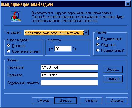 Далее необходимо выбрать параметры новой задачи: тип анализа, класс симметрии, точность решения, единицы измерения длины и др. Геометрию и свойства задачи можно выбрать из ранее созданных файлов рисунок 3.3.