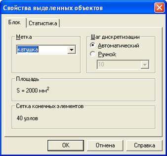 Блок – непрерывная, возможно не односвязная, область, граница которой образована ребрами и, возможно, изолированными вершинами. Блок может содержать отверстия, образованные замкнутыми или разомкнутыми цепочками ребер или изолированными вершинами. Для описания физических свойств среды каждому блоку, входящему в расчетную область, должна быть присвоена метка. Помимо описания свойств среды, метки блоков также используются для задания распределенных источников поля. Сетка конечных элементов создается в каждом блоке автоматически или с учетом шага дискретизации, заданного в отдельных вершинах. В непомеченных блоках расчет поля не производится независимо от того, построена ли в них сетка конечных элементов.