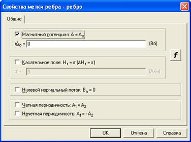 Свойства метки ребра задается для одного из возможных граничных условий. Условие Дирихле, задающее на части границы наперед известный векторный магнитный потенциал А0 в вершине или на ребре модели. Это граничное условие определяет поведение нормальной составляющей индукции на границе. В программе ELСUT условие Дирихле задается как функция координат в виде: