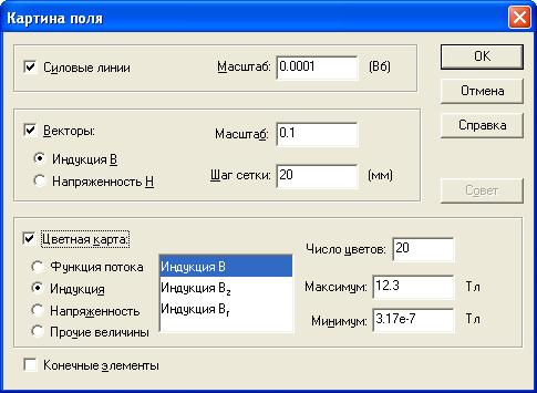 · При помощи команды «Картина поля» выбрать способы графического представления полевых характеристик, их масштабы и диапазоны;
