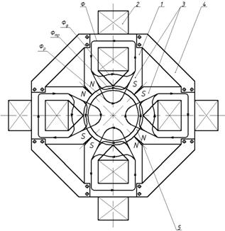 В полюсном наконечнике основной магнитный поток Ф разделяется на четыре составляющие: