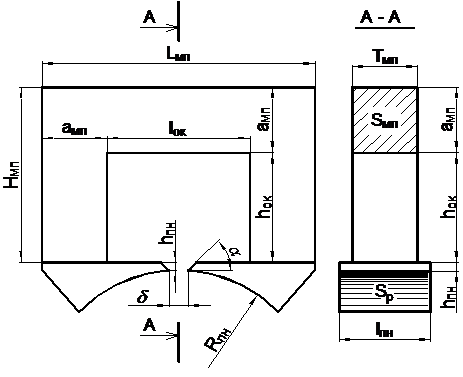 Следующий шаг в создании модели – это построение магнитопровода. Геометрия магнитопровода характеризуется пятью величинами, две из которых уже заданны расположением точки 4. Необходимо задать: ширину сечения – амп = 25 мм; высоту – Hмп = 67 мм; высоту окна катушки hок = 42 мм.