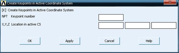 В окне Create Keypoints in Active Coordinate System (рисунок 3.44) в поле Keypoint number – вводится номер компонента, а в X, Y, Z Location in active CS координаты точки.