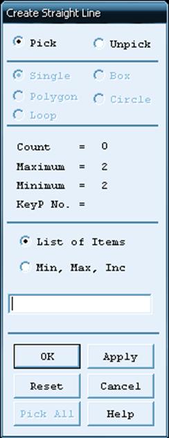 В появившемся окне выбора Create Straight Line (рисунок 3.45), с помощью курсора следует указать точки, через которые будет проведена линия. Если при таком способе была выбрана лишняя точка, то в окне следует выбрать Unpick, затем отметить ошибочную точку и снова переключиться на Pick.