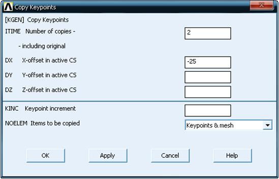 В окне выбора следует указать точку 4 и нажать OK. В появившемся окне Copy Keypoints (рисунок 3.48) в поле Number of copies вводится количество копирований (минимум 2); в полях DX, DY, DZ – расстояние, на которое копируется точка вдоль оси. Направление копирования задается знаками (+/-).