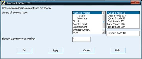 - Выбор типа элемента (магнитный векторный, магнитный скалярный);