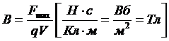 т. е. равна силе воздействия магнитного поля на пробный заряд, перемещающийся перпендикулярно магнитному полю с единичной скоростью и измеряется в системе СИ в отношении Вебер на метр квадратный