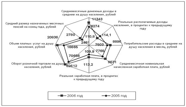 За счёт средств областного бюджета в 2006 году населению взамен некоторых ранее предоставляемых в натуральном виде льгот выплачено ежемесячных денежных выплат (ЕДВ) на общую сумму 2,5 млрд. рублей. Основные индикаторы уровня жизни населения Самарской области представлены ниже (рис.2)