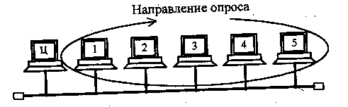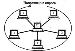 Централизованное управление, как и в звезде (физически шина, но логически звезда). Ц посылает всем АП запросы, выясняя, кто хочет предать, разрешая ему передачу. После окончания передачи АП посылает сообщение, что он закончил и Ц начинает опрос снова. Единственное отличие от звезды, что Ц не перекачивает информацию от одного АП к другому, а только управляет обменом.