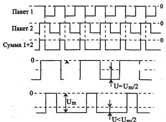 Сигнал в коде Манчестер-2 всегда имеет постоянную составляющую, равную половине размаха сигнала (если один из двух уровней сигнала нулевой). Однако в случае столкновения двух и более пакетов (коллизии) это правило выполняться не будет. Постоянная составляющая суммарного сигнала в сети будет обязательно больше или меньше половины размаха (рис. 6.9). Ведь пакеты всегда отличаются друг от друга и к тому же сдвинуты друг относительно друга во времени. Именно по выходу уровня постоянной составляющей за установленные пределы и определяет каждый сетевой адаптер наличие коллизии в сети.
