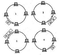 Кольцевая топология имеет свои особенности при выборе управления обменом. Важным фактором является то, что любой пакет, посланный по кольцу последовательно пройдя всех абонентов, через некоторое время возвратится в ту же точку - топология замкнутая. Здесь нет одновременного распространения сигнала в обе стороны как по шине. Отметим, что сети типа кольцо бывают однонаправленными и двунаправленными. Мы будем рассматривать только однонаправленные, как более распространенные.